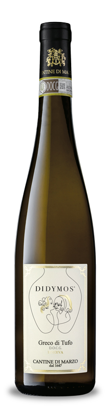 Didymos è un Greco di Tufo dal carattere unico, vinificato in anfora. Per distinguere questa bottiglia dalle altre della gamma, il titolare Ferrante Somma ha voluto inserire un’illustrazione dei propri figli gemelli, da cui il nome Didymos, che in greco significa “gemelli”. L’etichetta si distingue per uno stile essenziale e moderno: un’unica linea continua, senza interruzioni, che disegna i contorni dell’anfora e i due volti, impreziositi da dettagli in oro a caldo sulle chiome dorate.