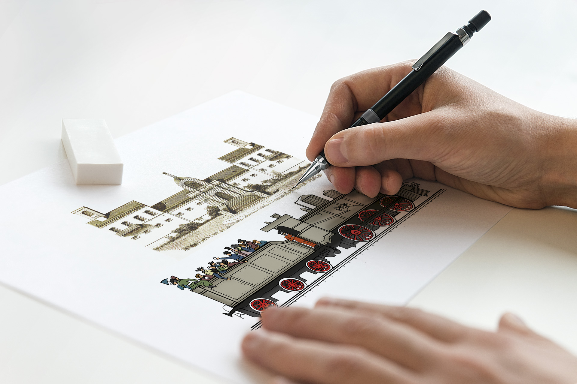 L’azienda non disponeva di illustrazioni d’archivio, ma la nuova grafica doveva armonizzarsi con lo stile della gamma CRU. Ispirandoci al nome del vino, abbiamo scelto di raffigurare una locomotiva dell’800, che all’epoca si fermava alla stazione di Tufo, proprio di fronte alla sede delle vecchie miniere, anch’esse riprodotte nell’etichetta.